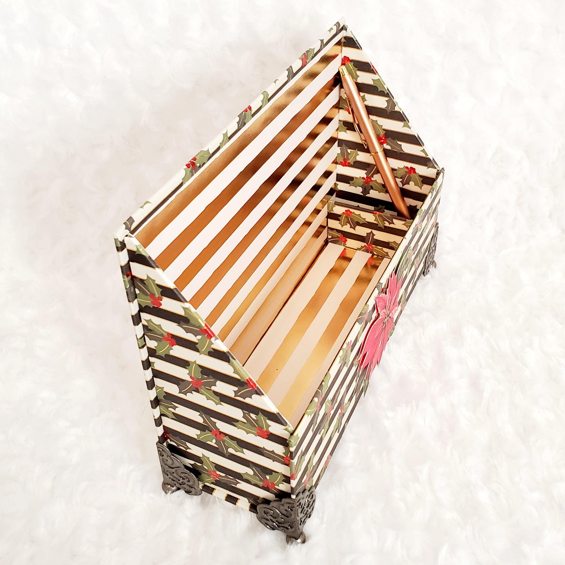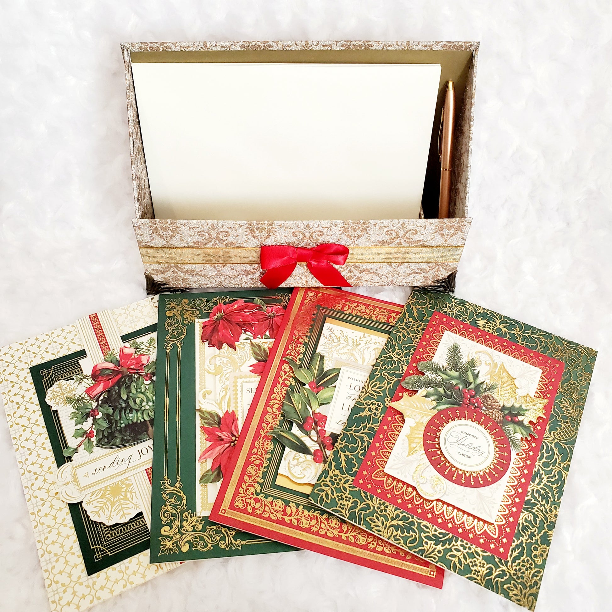 Send your season's greetings with our exquisite 5x7 Green and Gold Striped Holly cards. These 3D cards are meticulously crafted by hand, featuring gold foil embossing and elegant embellishments. Keep them organized in the included reusable caddy, measuring 8x6x3 inches. Also included is a slim gold ink pen and envelopes to complete your holiday greetings.